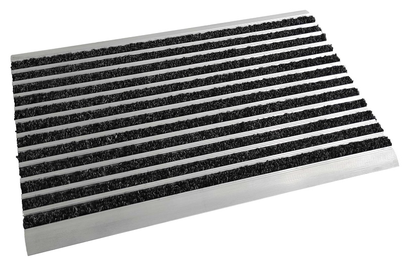 Грязезащитные ворсовые ковры Каскад c уникальной структурой поверхности в виде переменного сочетания ворса и алюминиевого скребка.